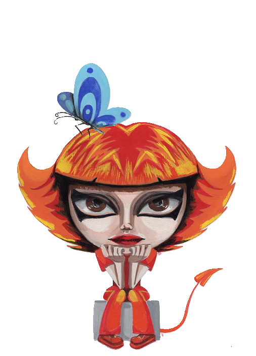 Meet a little rebel with a spark of wonder in her eyes. “Fire & Flight” captures the moment where wild imagination meets a touch of sweetness—a bold girl with fiery hair and devilish horns, sitting deep in thought while a delicate blue butterfly lands softly on her head.