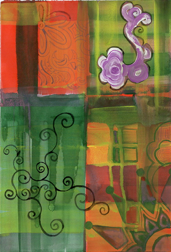 Vivid greens meet bursts of orange and sunlight, while swirling black vines stretch and wander across patchwork fields. “Secret Garden” is an invitation to stroll through a landscape where colors grow wild and patterns bloom unexpectedly. The purple flower in the upper corner seems to float, a playful spirit among layers of hidden shapes and gentle textures.