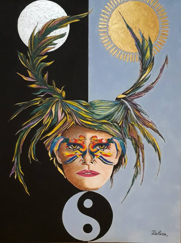 Between light and shadow, day and night, a masked face emerges—its features adorned with vivid color and crowned by flowing feathers. On one side, the silver moon glows softly against a dark sky; on the other, a radiant golden sun shines with energy and warmth. Below, the yin-yang symbol holds it all together, a silent promise of balance and unity.