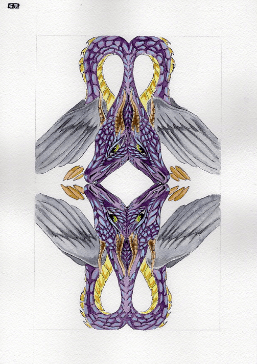 Step into a world of fantasy with this captivating illustration, where two dragon-like creatures mirror each other in hypnotic symmetry. With their vivid violet scales, glowing green eyes, and expansive wings, these mythical beings seem to come alive on the page. The artwork plays with themes of duality, strength, and imagination—inviting every viewer to find their own meaning in the intertwined forms.